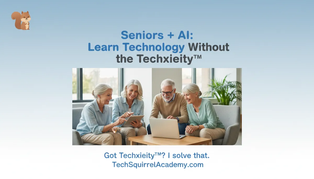 At TechSquirrelAcademy™, we believe there’s no such thing as “too old to learn” or “too late to start.” We replace Techxiety™ with calm confidence—one conversation, click, and smile at a time.